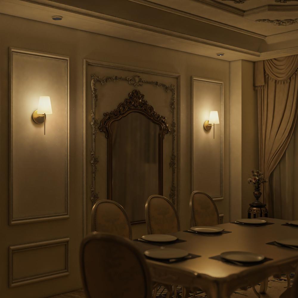 ابجورة حائط ذهبية لديكور غرفة النوم الكلاسيك، تعتبر من أفضل جداريات الإضاءة ذات الطابع الكلاسيك الذي يجمع بين فخامة اللون الذهبي ورقي اللون الأبيض.