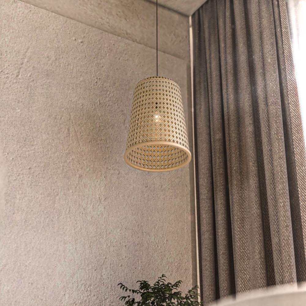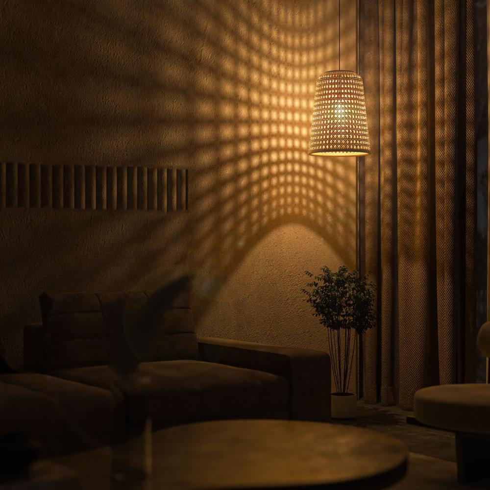 - التصميم: إنارة معلقة من الراتان والمعدن بأسلوب ريفي أنيق
