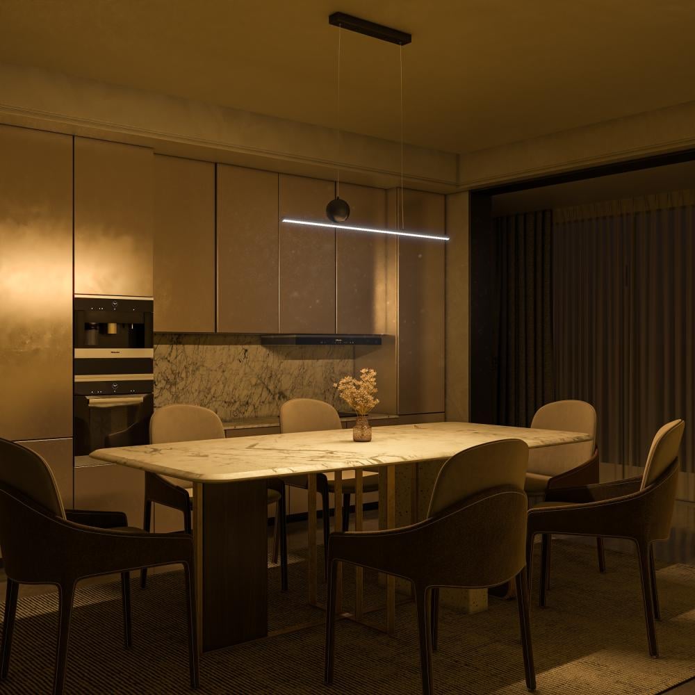 إنارة خطية ليد معلقة تنير بدرجة اللون الأصفر الدافئة التي تعكس احساسًا بالهدوء والراحة، وتناسب ديكورات غرف المكتب.