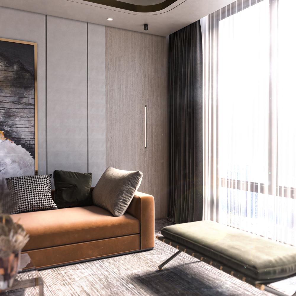 إنارة خطية معلقة ليد تُضاء بدرجة اللون الأصفر الدافئة المريحة للعين، والتي تخلق أجواءًا هادئة في المساحة الداخلية.