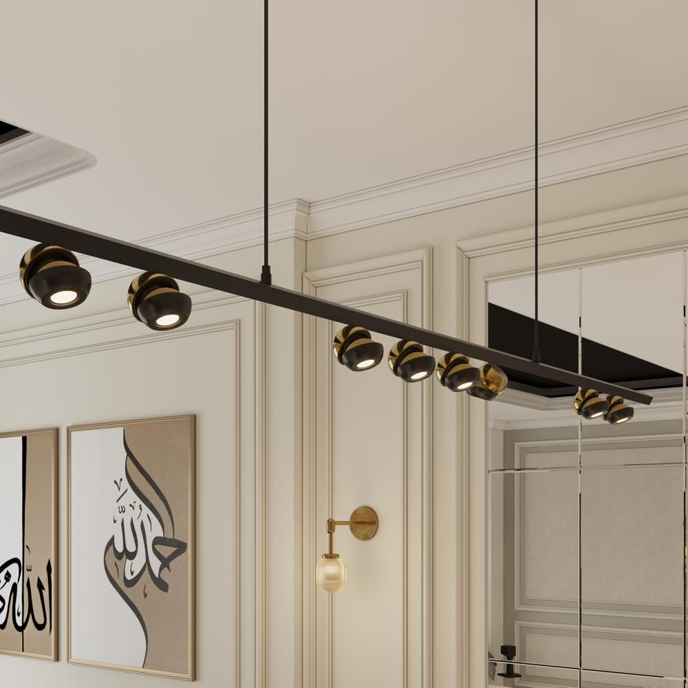 إنارة مودرن معدنية طولية 8 عدسات ليد متحركة تنير المساحات الواسعة بدرجة إنارة 3000 كالفن دافئة تناسب الديكورات المنزلية.
