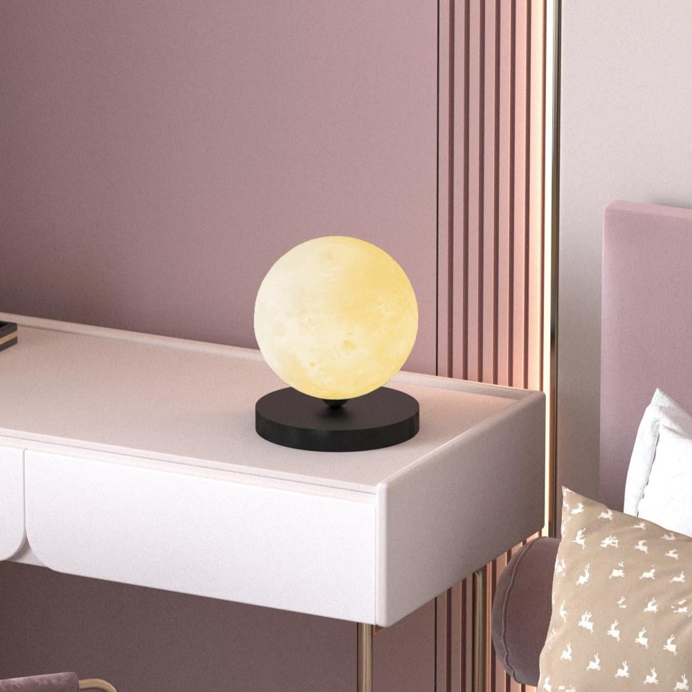 أبجورة مودرن دائرية أسود بشكل القمر تمنحك إضاءة ديكورية مميزة تضيف أجواء حالمة في أرجاء المنزل، بفضل تصميمها العصري المستوحى من جمال القمر المكتمل مع قاعدة سوداء فاخرة وكرة مضيئة أنيقة.