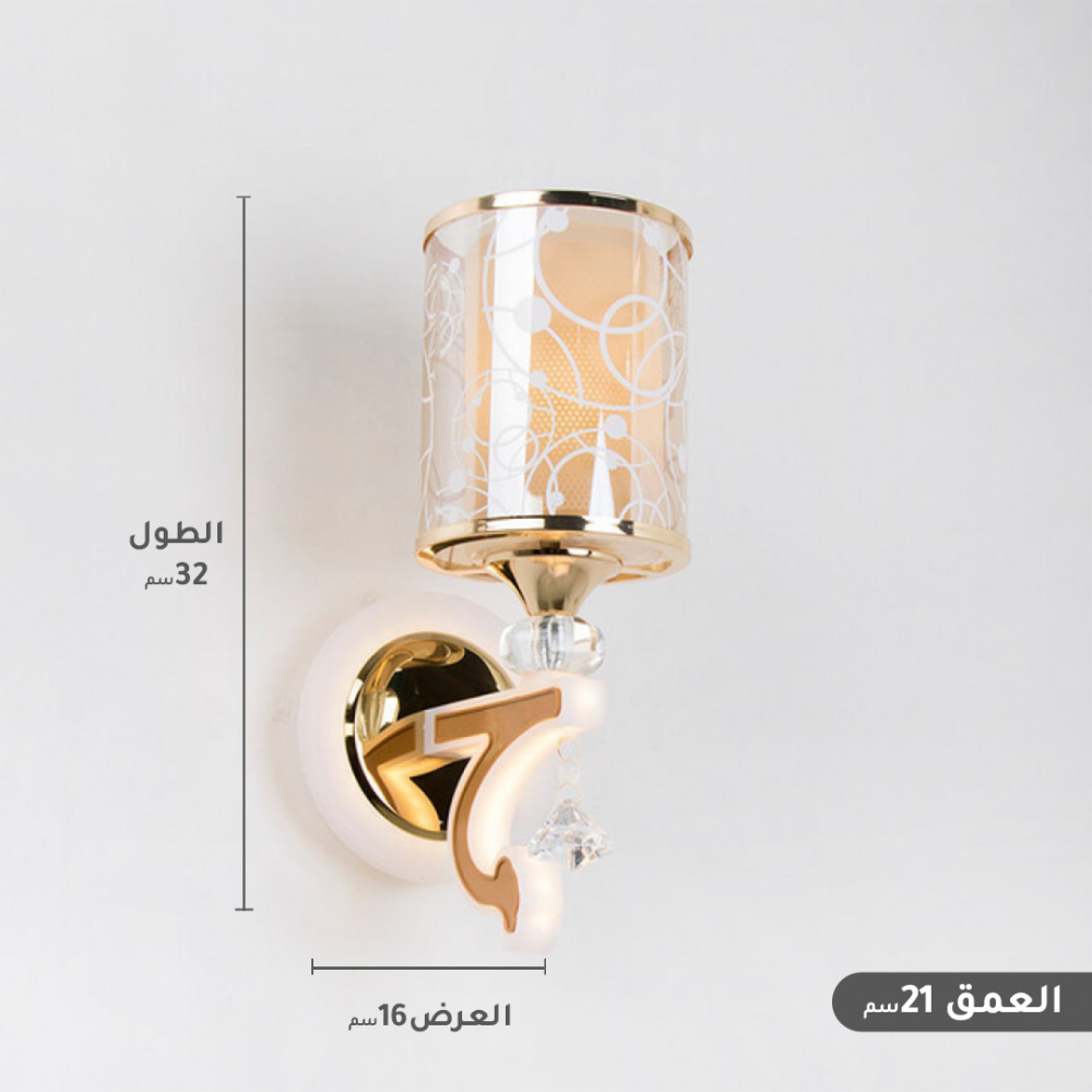 إضاءة حائط داخلي بتصميم جمالي أنيق، وقاعدة ذهبية دائرية، وكأس إنارة مزخرف ليحمل لمبة من النوع E 27 الموفرة للكهرباء.