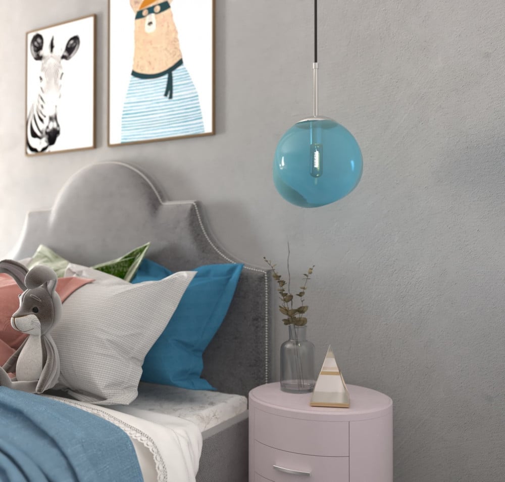 إليك أفضل تصميم ثريا معلقة بلونها الأزرق الساحر في شكل زجاج كروي مضغوط ، لتستمتع بإنارة هادئة مع تصميم ديكوري مميز.