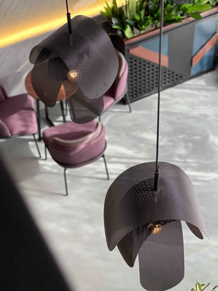 بتصميمها الأنيق المصنوع من الشرائح المعدنية السوداء التي تعكس الضوء بنعومة لتمنحك إنارة مريحة ومظهر راقٍ يناسب المجالس والغرف الحديثة.