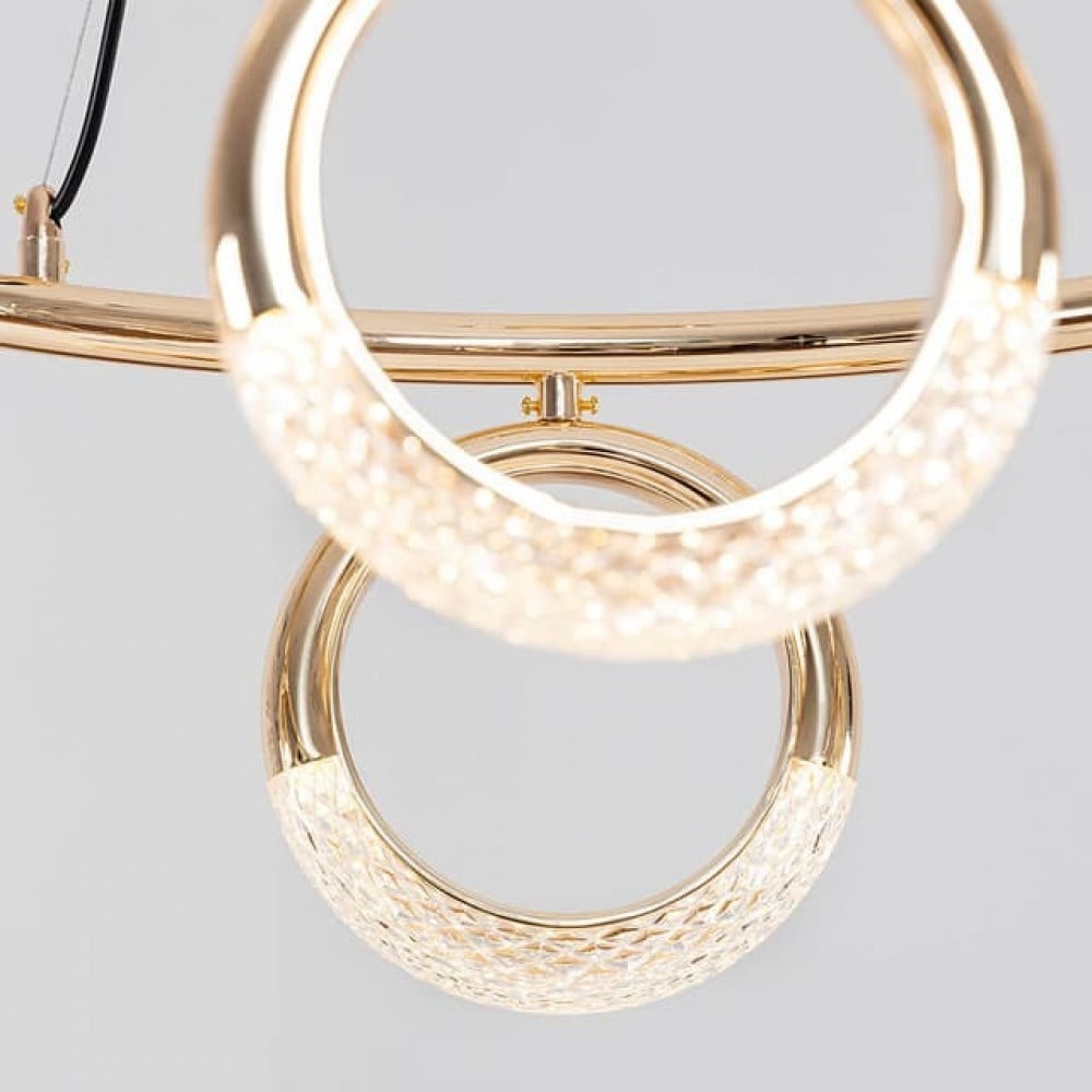 ـتأتي ثريا علاقي ذهبية بـ 6 دوائر مضيئة بحلقة معدنية كبيرة تتفرع منها 6 حلقات من المعدن الامع بأحجام متشابهة و ذات نهايات زجاجية مضية و أنيقة من لمبة LED مدمجة بثلاث مستويات من الألوان حيث و توفر الحلقات الذهبية المضيئة انارة منتشرة وموزعة بطريقة فنية جميلة . حيث تأتي الحلقات بلون ذهبي لامع من الجزء العلوي أما الجزء السفلي فهو شفاف ومضيء بثلاث مستويات ألوان تجمع بين العصرية والفخامة المثالية.