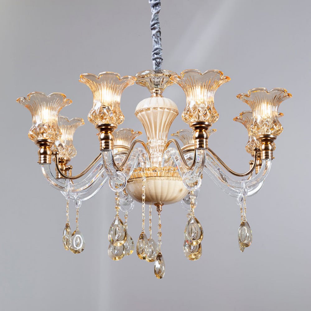 وتصنع ثريا علاقي كلاسيك 8 اذرع بكفاءة عالية من هيكل معدني مقاوم للصدأ والتآكل تنبثق منه اذرع مضيئة مصنوعة من الزجاج الراقي والمزخرف حيث تتدلى منه قطع كرستال قمة في الجمال والرقي.