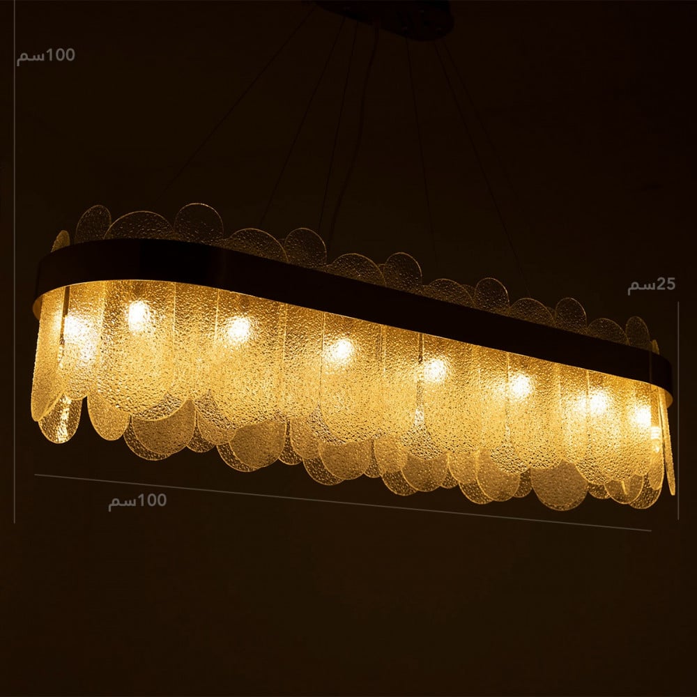 تدمج ثريا مودرن ذهبية كبيرة بزجاج بيضاوي بين المزايا العصرية للانارة الساحرة مع فخامة وعراقة التصميم ، لذا فإن تركيب هذه الثريا في غرف المنزل او المجالس او غرف الضيافة يبرز الجمال والأناقة في المكان كما توفر الانارة الشاملة باللون الاصفر بفضل احتوائها على 16 لمبة من نوع G9 والتي تاتي بضوء أصفر وطيف مريح للرؤية.