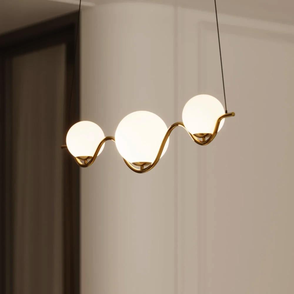 ثريا مودرن ذهبي مع ثلاث لمبات دوائر من يو كاندل بتصميم فريد يجمع بين الإبداع والعصرية، حيث تتكون من ثلاث كرات زجاجية مضيئة تشبه الأقمار، وهي مثبتة على ذراع معدني متعرج أنيق باللون الذهبي الفاخر. مصنوعة من أجود أنواع الحديد المقاوم للصدأ والزجاج المشتت للضوء لتمنح إضاءة ناعمة ودافئة تضيف لمسة من الفخامة إلى ديكور غرف المعيشة أو الصالات الراقية.