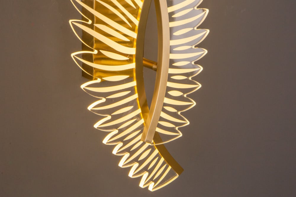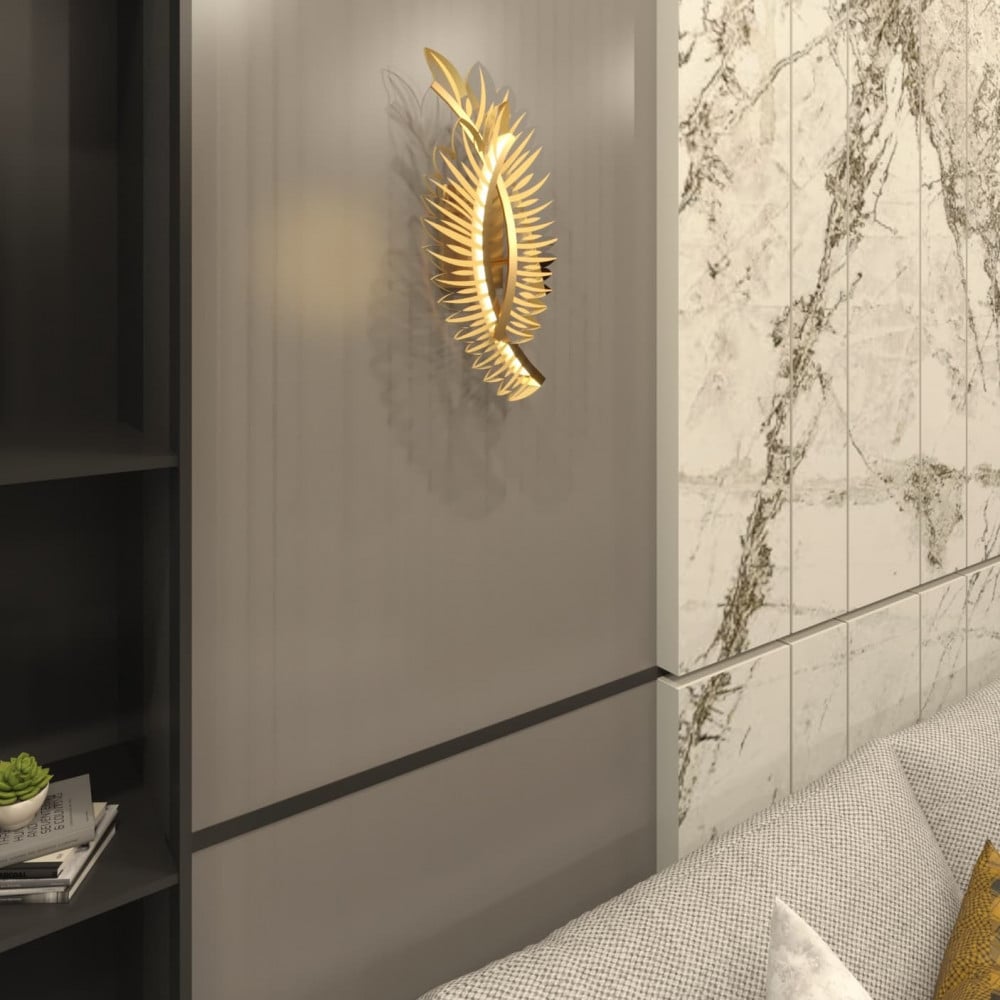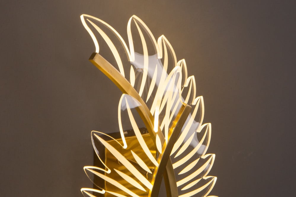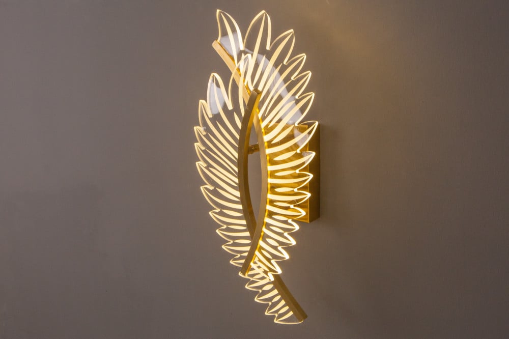 امنح منزلك لمسة من الفخامة والدفء مع أبليك جداري مودرن إضاءة صفراء ذهبي. يأتي بتصميم أنيق على شكل أوراق شجر مع قاعدة ذهبية لامعة، وينبعث منه ضوء أصفر دافئ يضيف أجواءً مريحة وراقية تناسب البيت العصري. مزود بضمان لمدة سنتين.