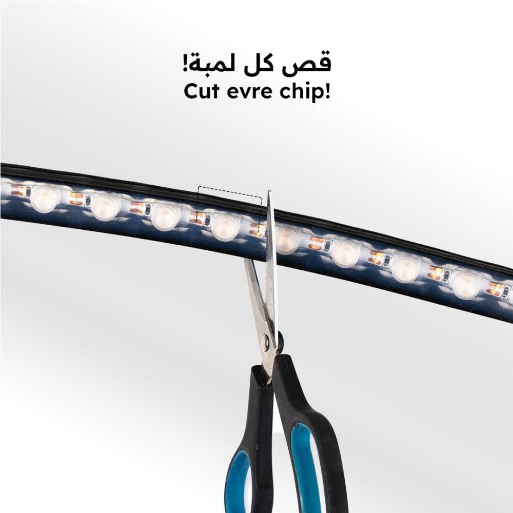 - مرونة في القطع: يمكن قطع الشريط بسهولة كل 2 سم (بعد كل لمبة)، مما يتيح لك ضبط الطول المناسب لأي تصميم أو مساحة ضيقة.