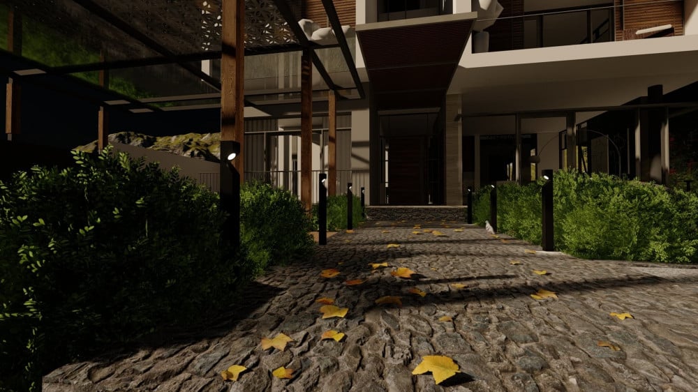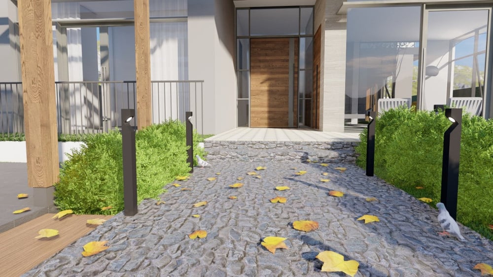 تصميم هندسي عصري بشكل مربع مائل يمنح لمسة ديكورية ويضيء الممرات والحدائق بإضاءة صفراء دافئة.