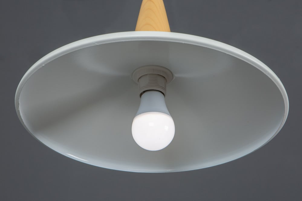 - التصميم: لمبة معلقة مفردة باللون الأبيض بقاعدة خشبية أنيقة