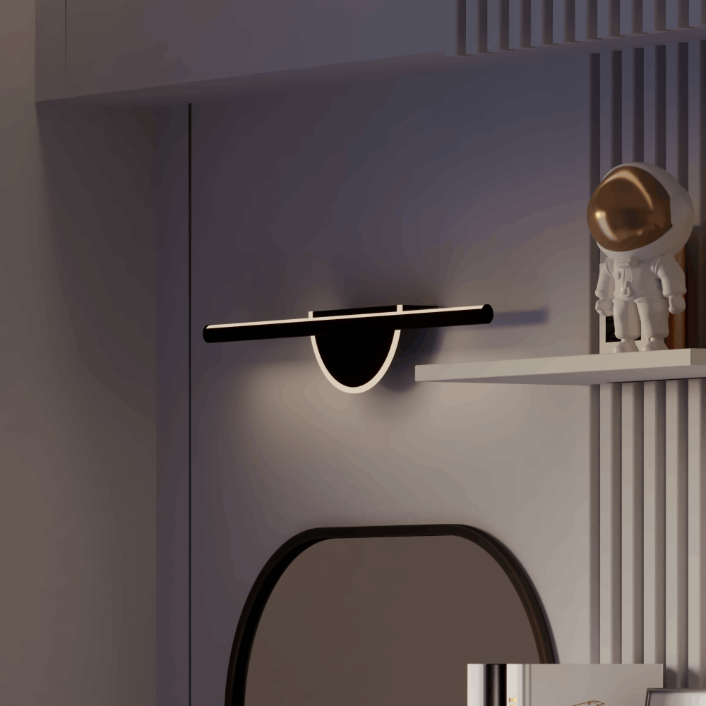 إضاءة جدارية خطية نحيفة بتصميم عصري باللون الأسود، مثالية لوضعها أعلى المرايا لتنعكس الإضاءة عليها بشكل ناعم وتمنح رؤية أوضح أثناء الاستخدام، كما تضفي لمسة ديكورية أنيقة على الغرفة.
