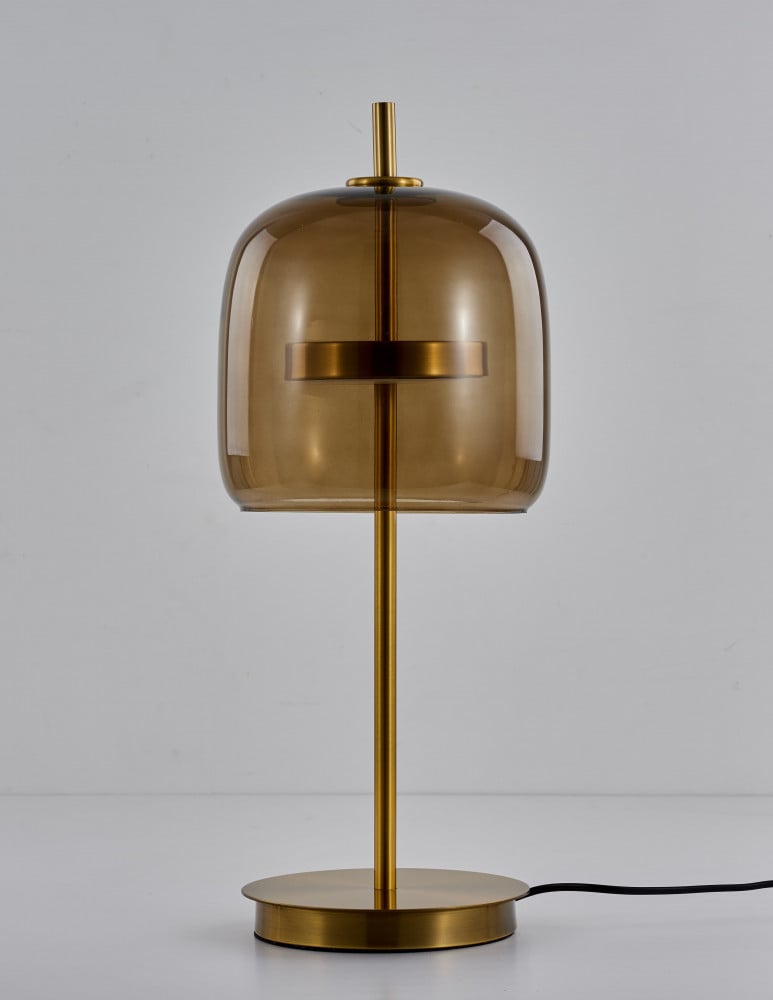 إليك أبجورات غرف نوم بجسم معدني من المعدن المطلي بالذهب، مع قاعدة دائرية عريضة، ومصباح مثبت على قاعدة من المعدن الذهبي داخل غطاء زجاجي شفاف أسطواني باللون العسلي المبهج.