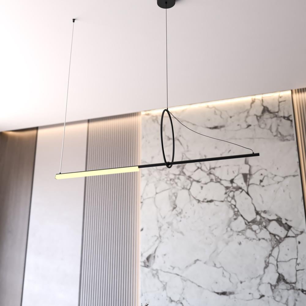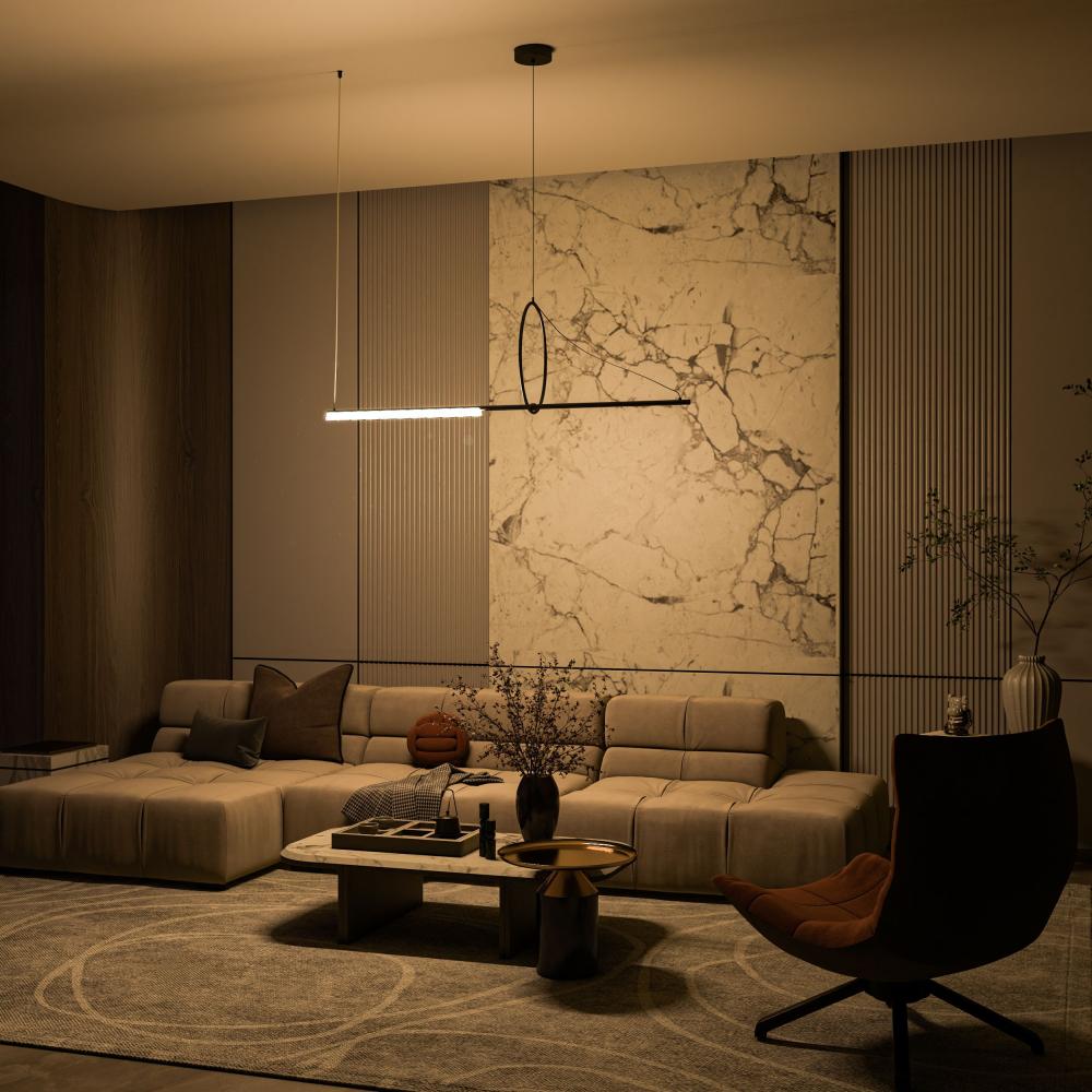 إنارة خطية مع دائرية ليد معلقة تنير بدرجة اللون الأصفر الدافئة التي تعكس احساسًا بالأناقة الديكورية في غرف الطعام.