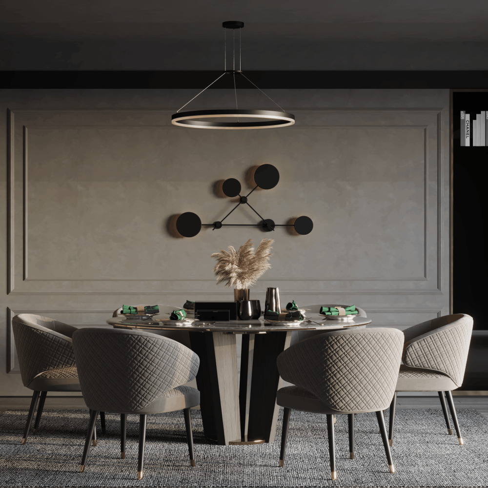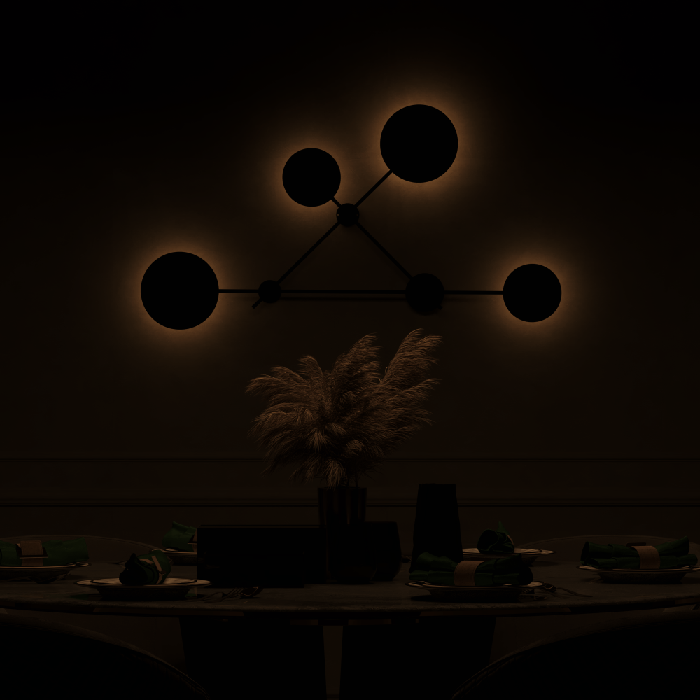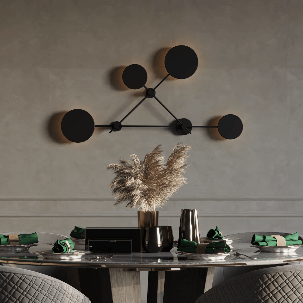 A contemporary wall light designed with 4 black circular lamps, perfect for women’s majlis and modern living spaces. It enhances the richness of your furniture and highlights the beauty of your décor.