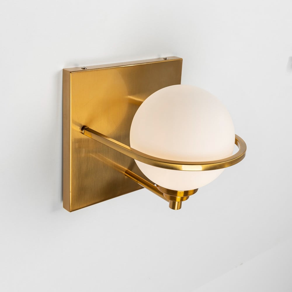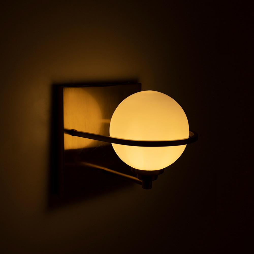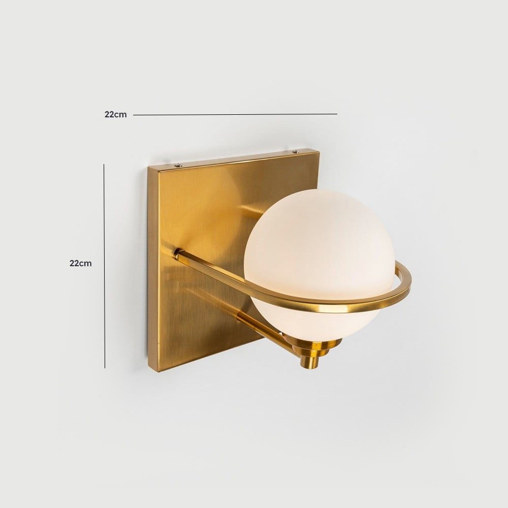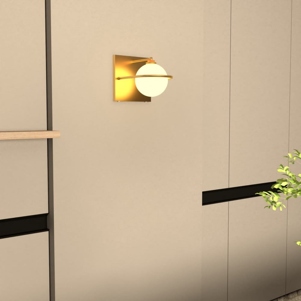 Enhance your interiors with the Modern Golden Glass Ball Wall Lamp, combining a shiny golden base with a frosted white glass globe that glows like a full moon, creating a sophisticated and modern atmosphere.